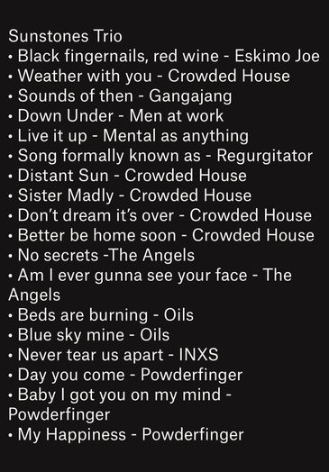 Sunstones Trio reproduce the finest renditions of all your favorite rock classics from the 70's, 80's, 90's, 00's and well beyond! An ideal choice for Taverns, Hotels, Pubs, Clubs, Corporate Functions, Private Parties, offering quality sound & lighting Sunstone Trio are well worth investing in.